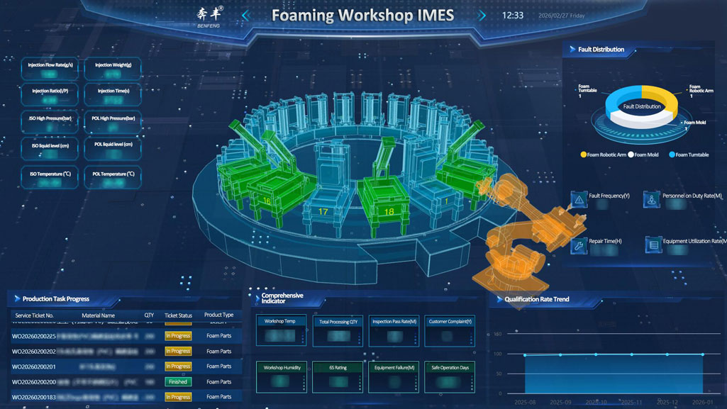 ภายในเมทริกซ์ดิจิทัลของ Benfeng Seats IMES (แพลตฟอร์มการผลิตอัจฉริยะของที่นั่ง Benfeng) เวิร์กช็อปการเกิดฟองซึ่งมีสภาพแวดล้อมการผลิตอัจฉริยะขั้นสูง ได้กลายเป็นรากฐานหลักในการหลอมประสิทธิภาพความสะดวกสบายของเบาะนั่ง