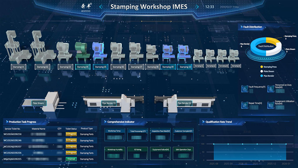 จุดเริ่มต้นหลักในการสร้างโครงเบาะนั่ง ติดตั้งสายการผลิตการปั๊มขึ้นรูปที่มีความแม่นยำ โดยอาศัยแพลตฟอร์ม IMES ในการตรวจสอบพารามิเตอร์กระบวนการแบบเรียลไทม์ ทำให้มั่นใจในความแม่นยำและความสม่ำเสมอของชิ้นส่วนที่ประทับแต่ละชิ้น วางรากฐานโครงกระดูกที่เชื่อถือได้สำหรับกระบวนการต่อๆ ไป
